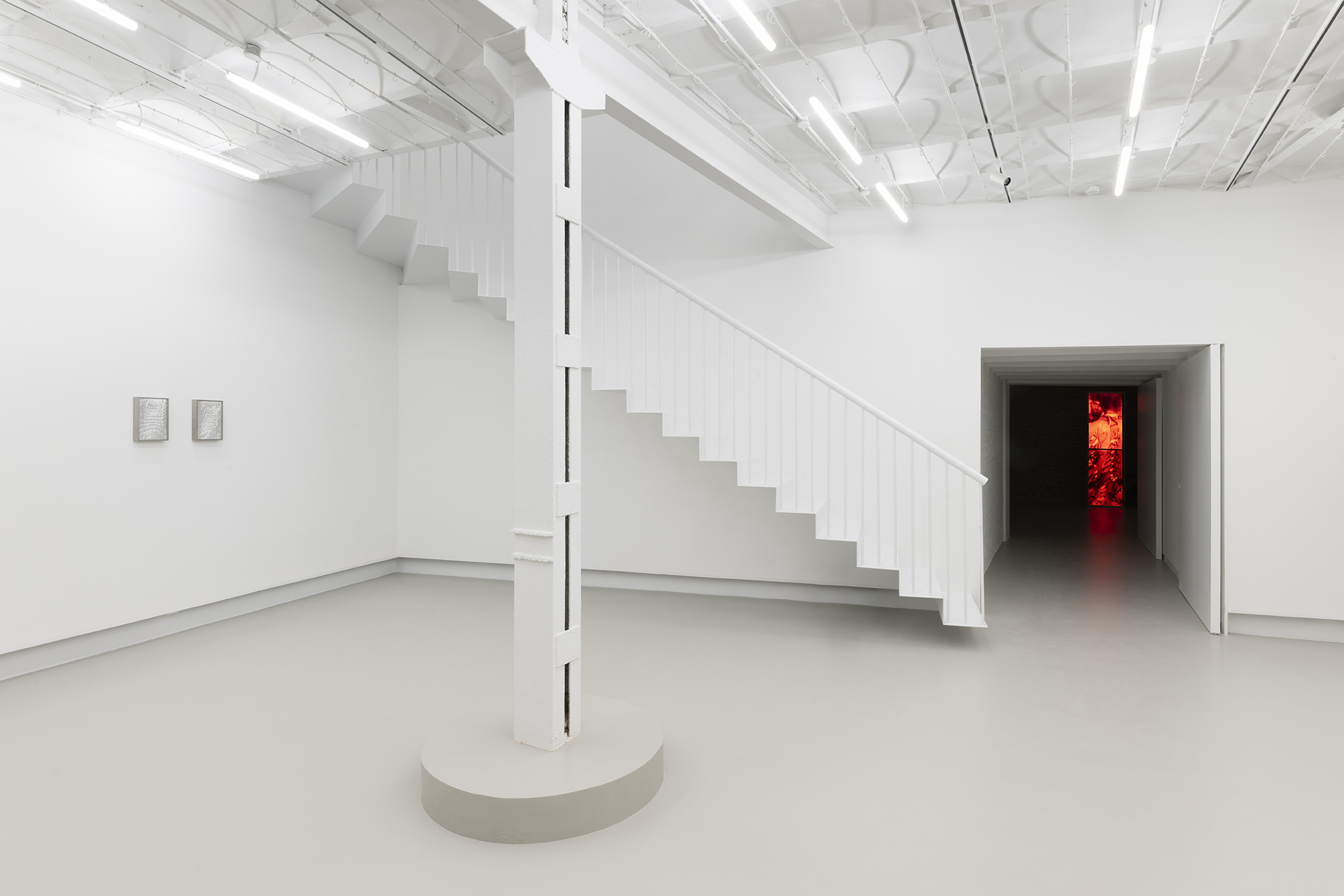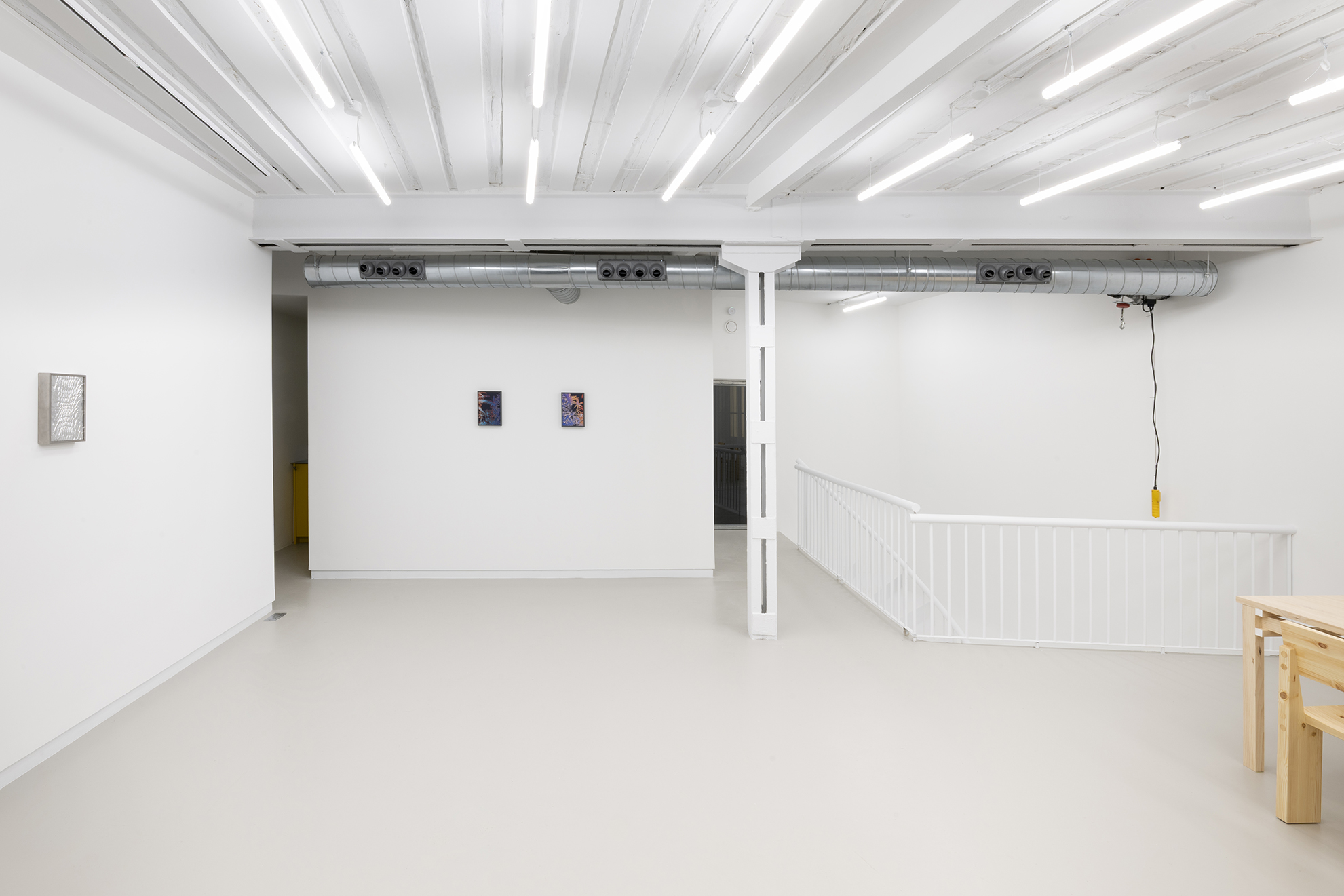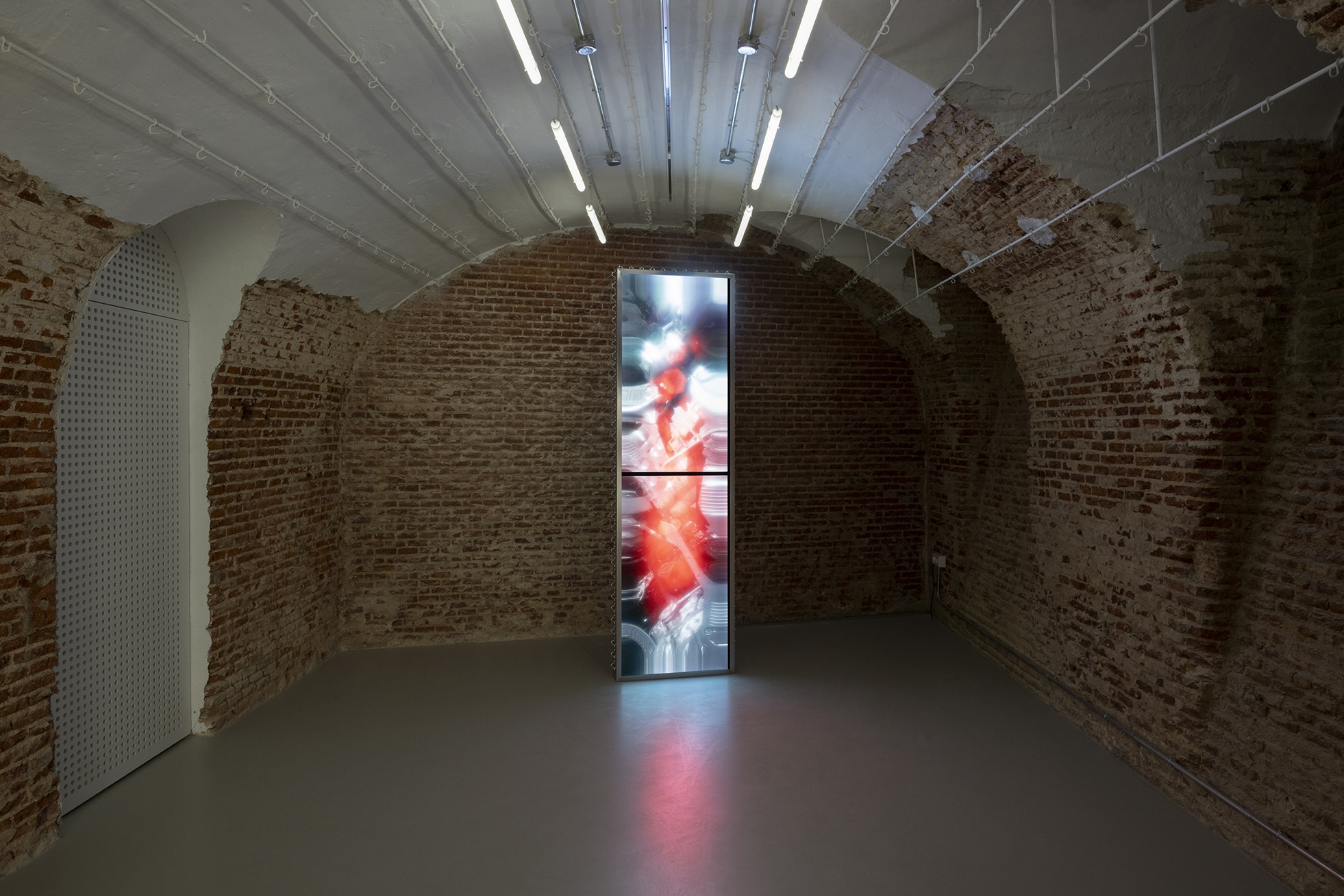 Drawing on her methodological origins of working with and from space, kokki grounds itself in a site-specific response to the building that now houses The Ryder Projects – a former ham-drying factory in Madrid’s Tribunal district. In Dia’s interpretation, the site epitomises how modernity conjoins technology and the organisation of flesh. Reimagining the hanging lines of cured hams, the spatial arrangement reflects the mechanised cadence of the assembly line, where flesh is segmented and reorganised by capital.