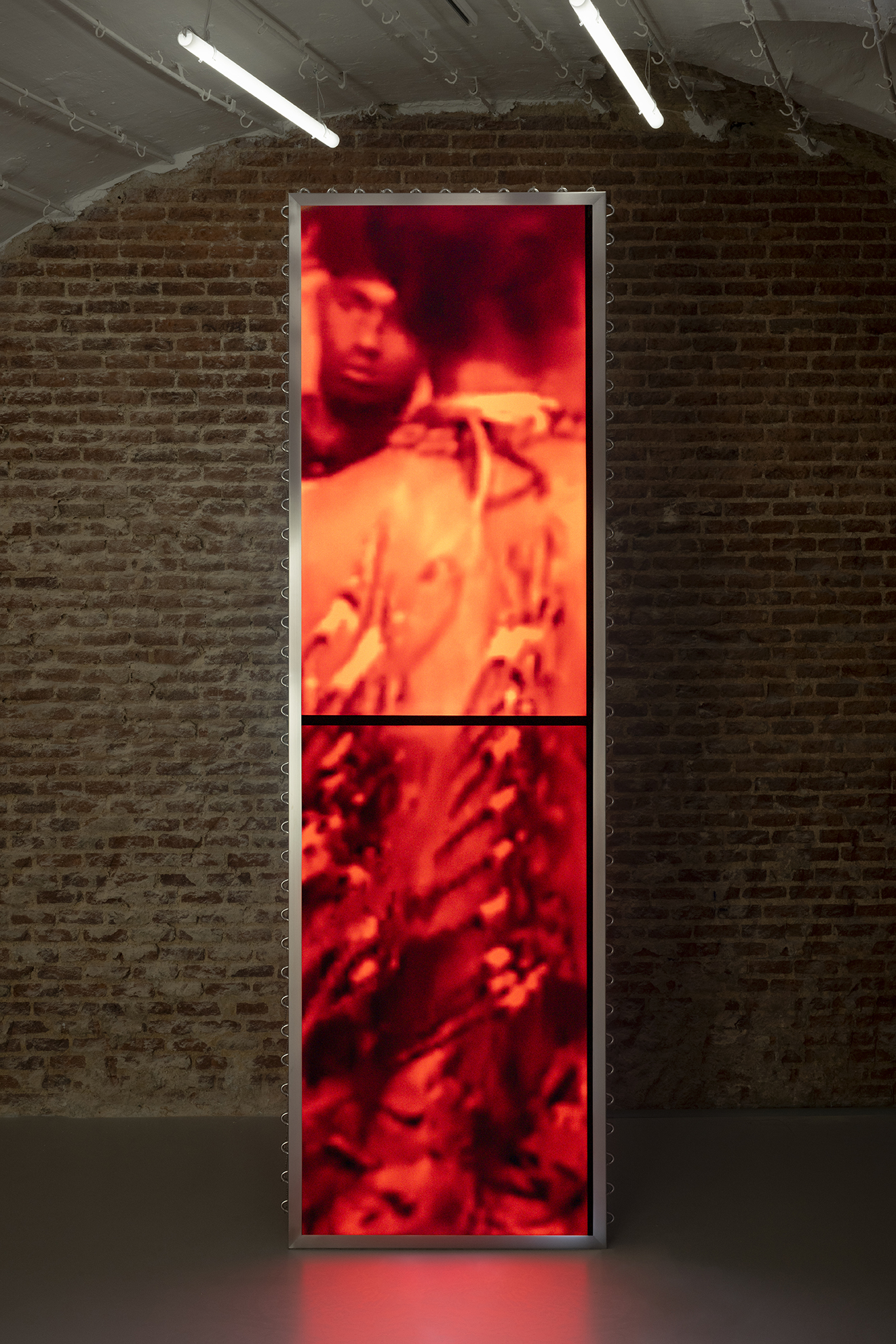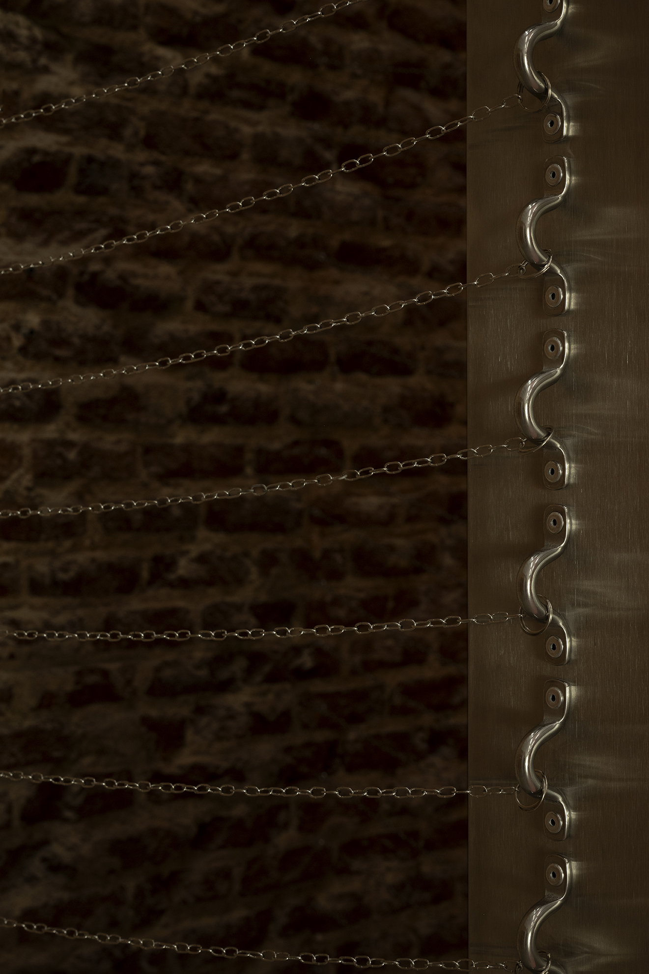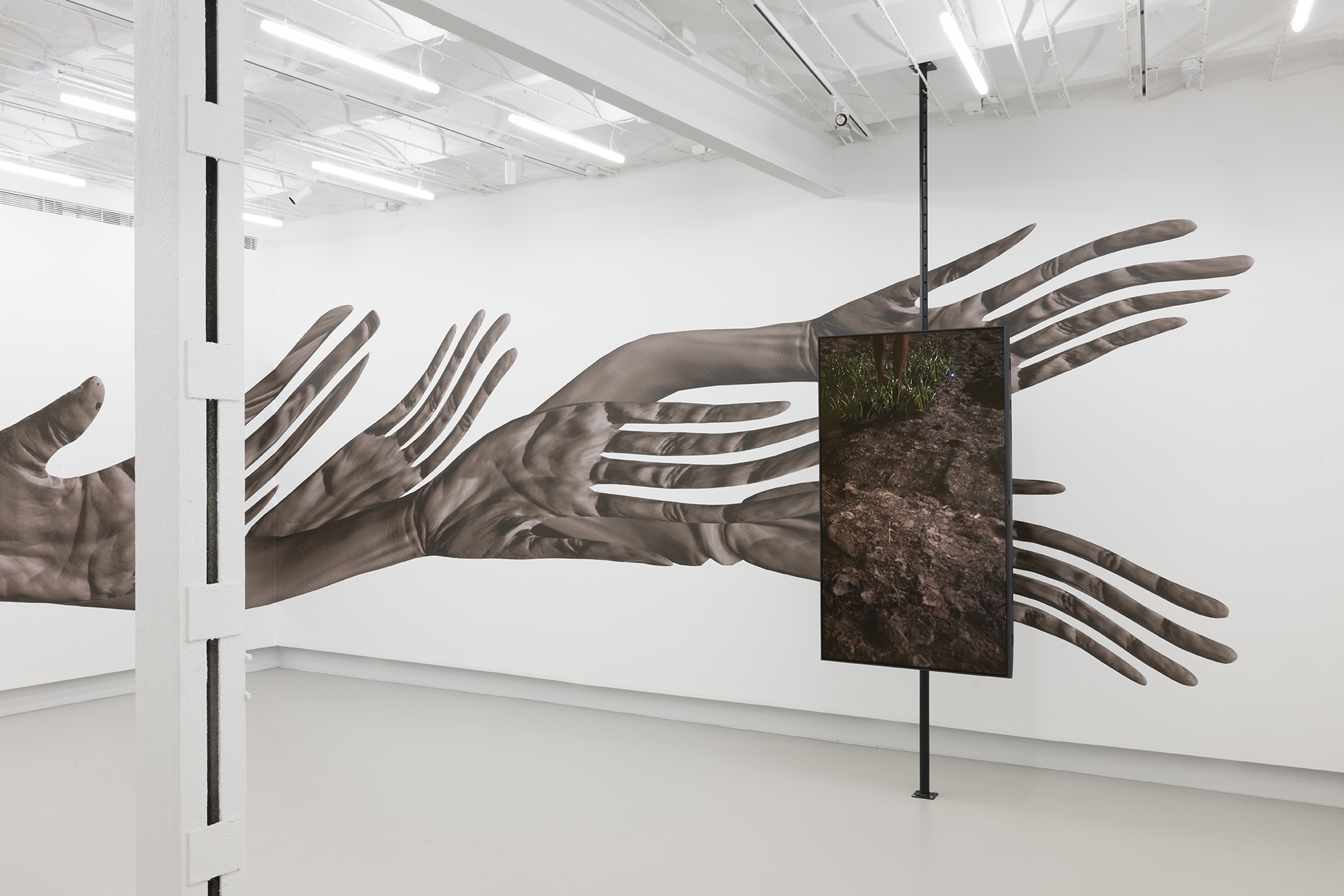 Drawing on her methodological origins of working with and from space, kokki grounds itself in a site-specific response to the building that now houses The Ryder Projects – a former ham-drying factory in Madrid’s Tribunal district. In Dia’s interpretation, the site epitomises how modernity conjoins technology and the organisation of flesh. Reimagining the hanging lines of cured hams, the spatial arrangement reflects the mechanised cadence of the assembly line, where flesh is segmented and reorganised by capital.